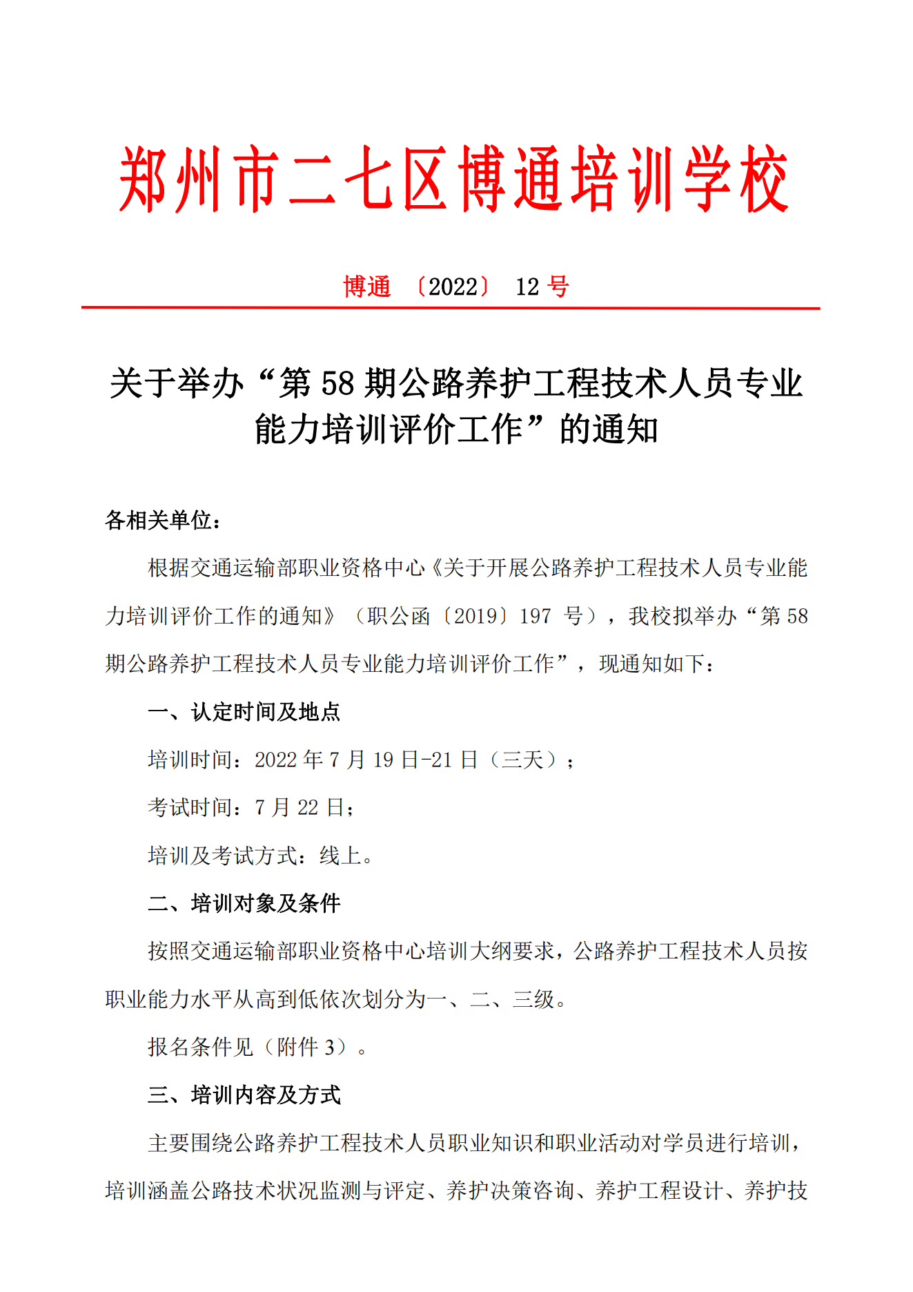 关于举办“第58期公路养护工程技术人员专业能力培训评价工作”的通知